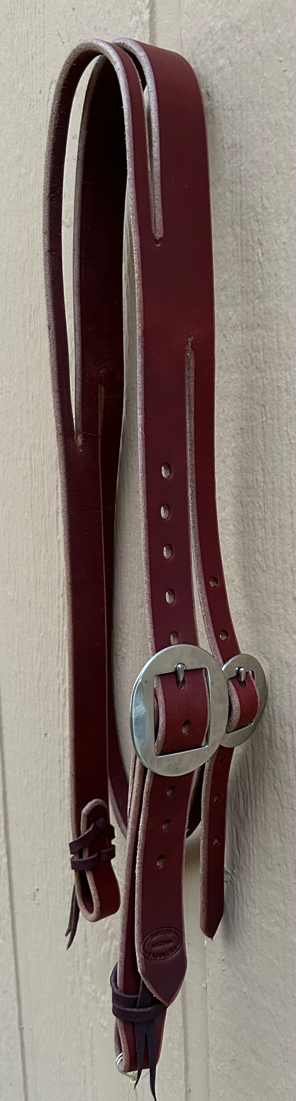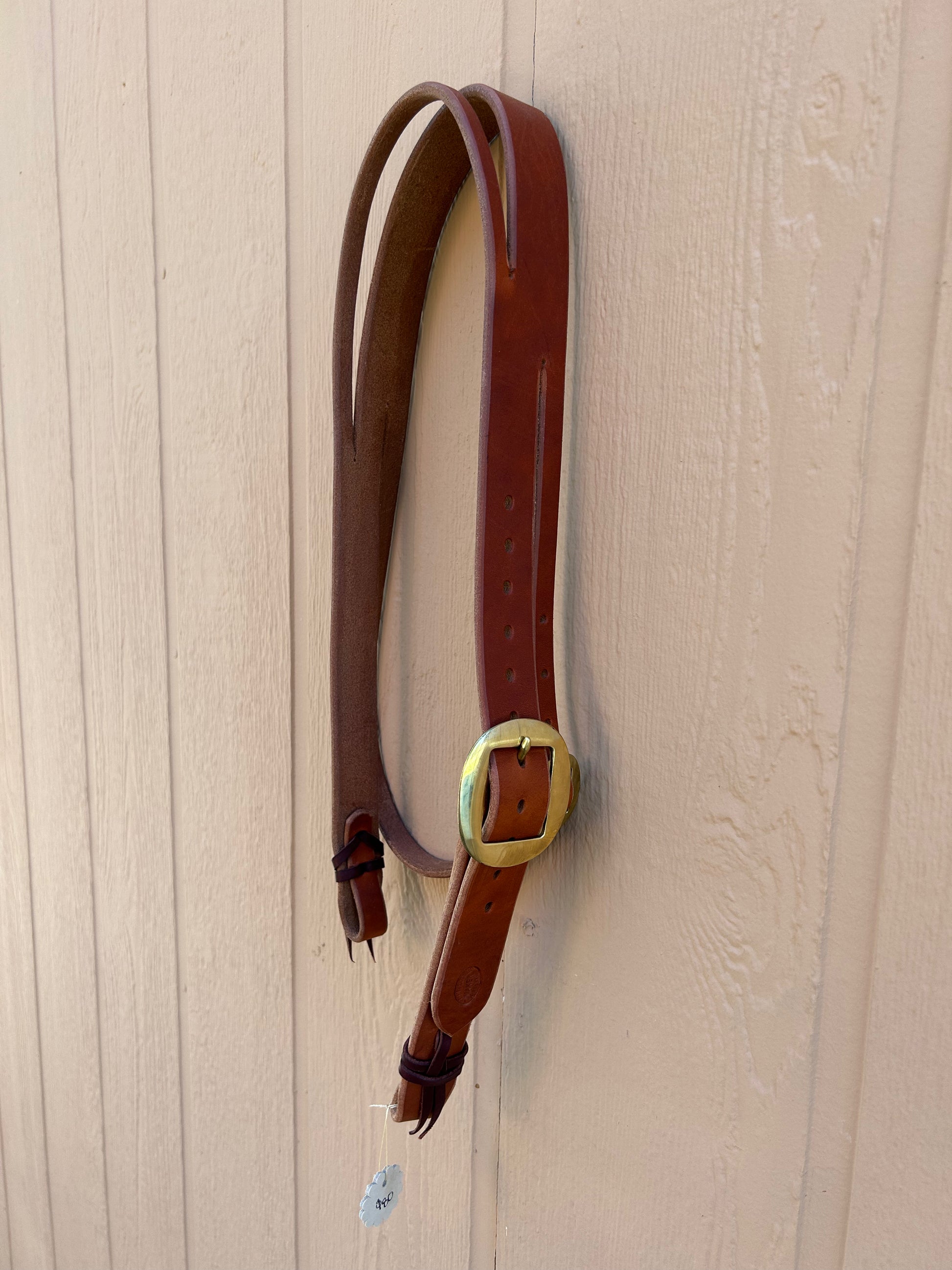 1 1/4” Split with Throatlatch made of heavy leather. For those horses that rub off your split ear.