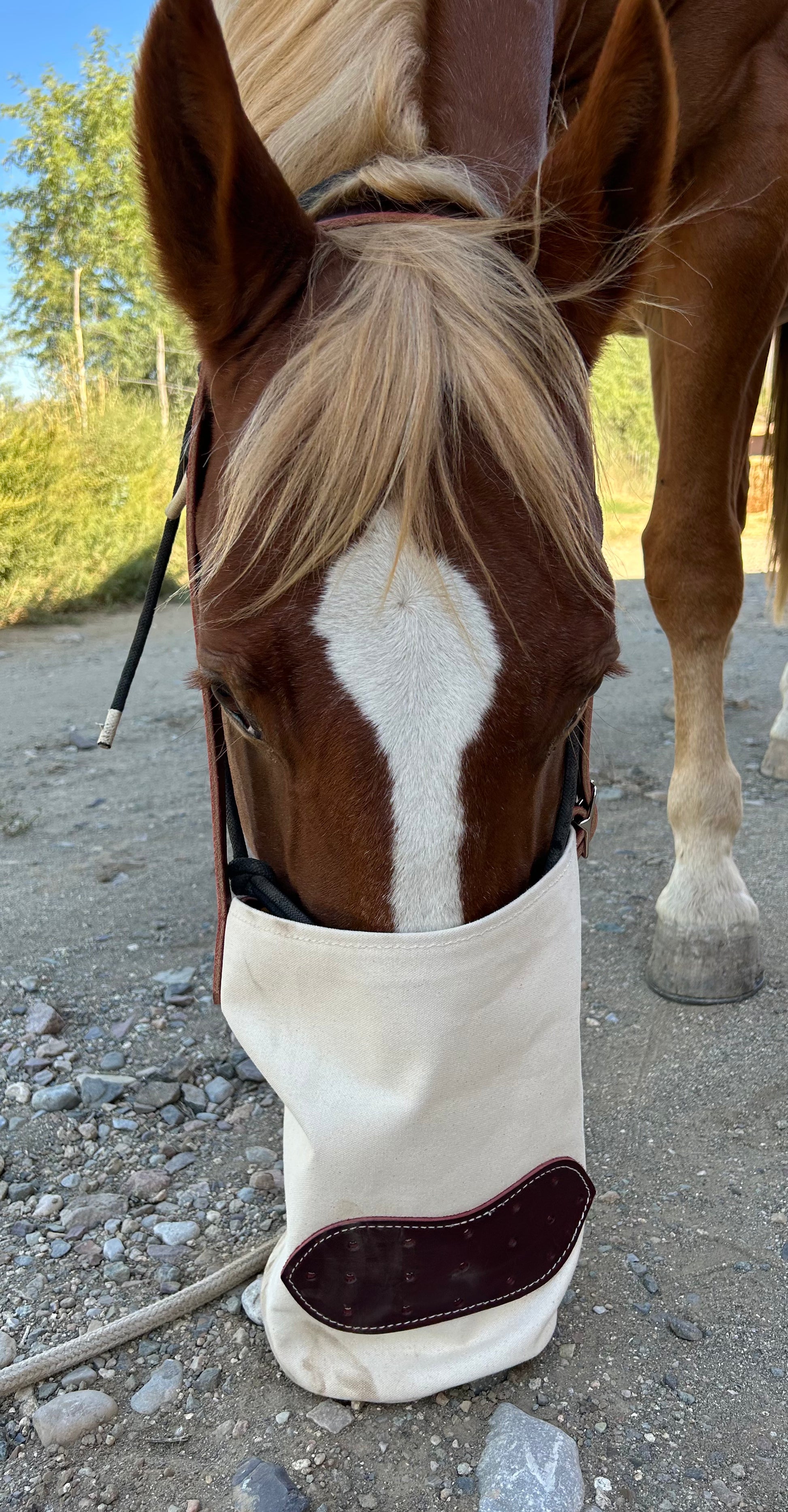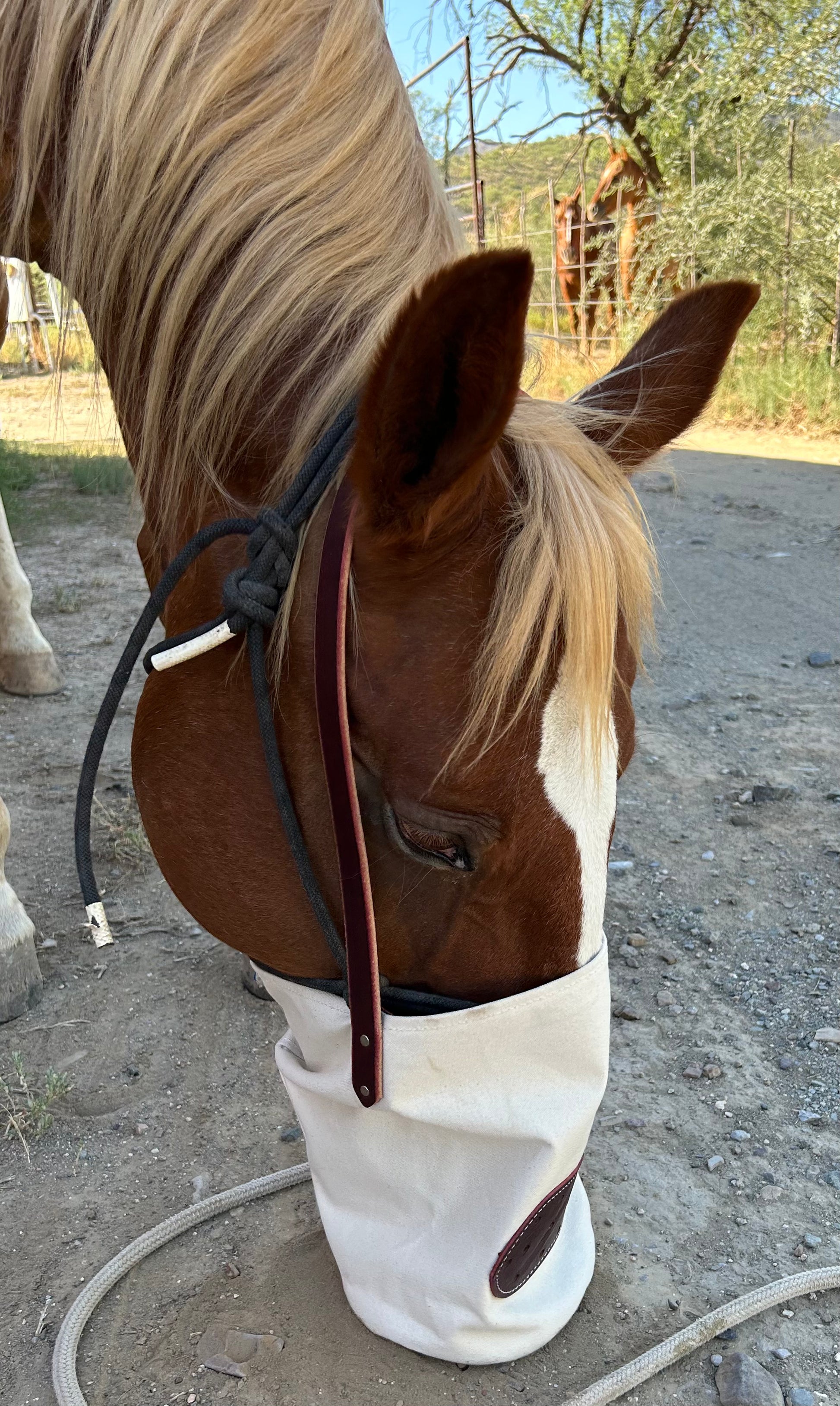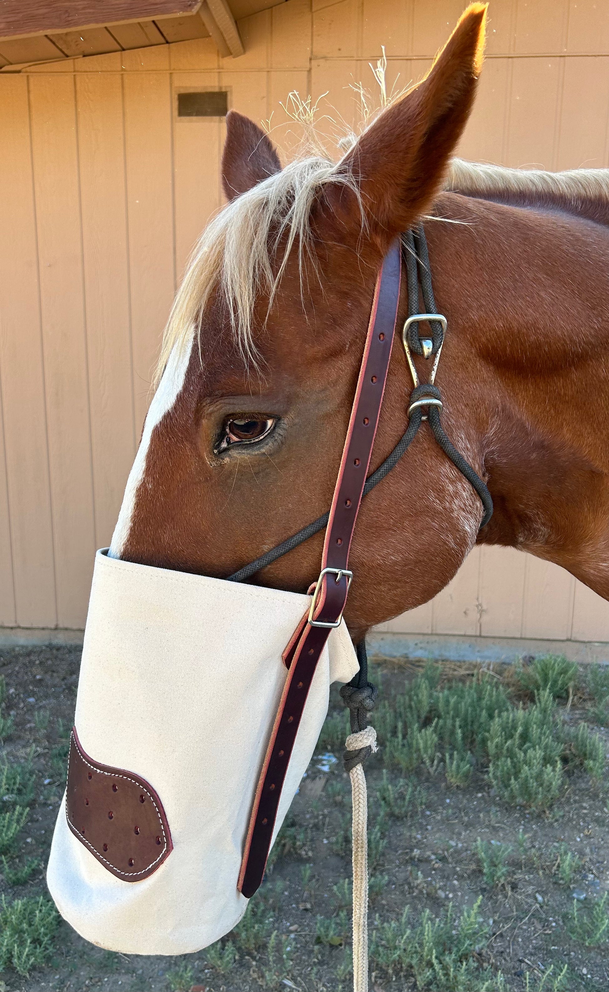 Canvas Morales with a leather “breather” across the nose. “Breather” has holes in case your horse decides to get a drink with the morale on.