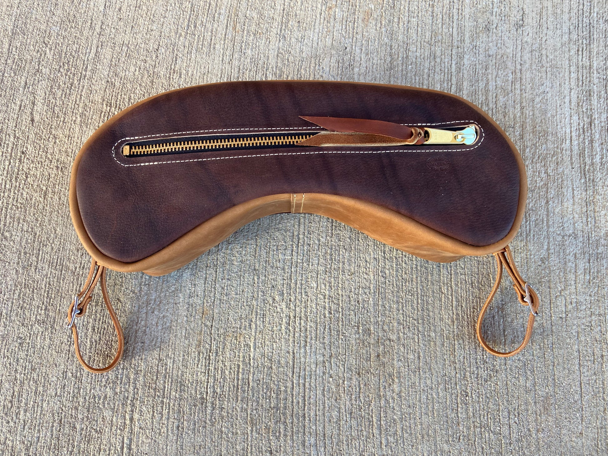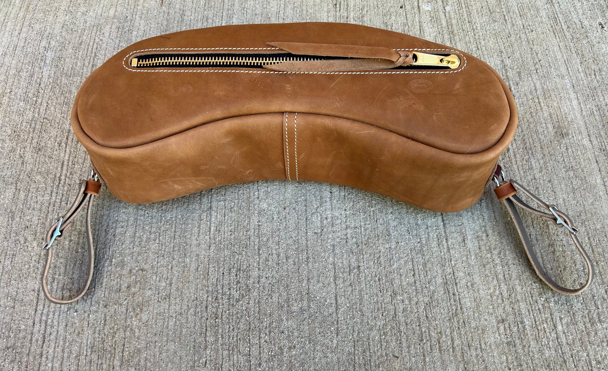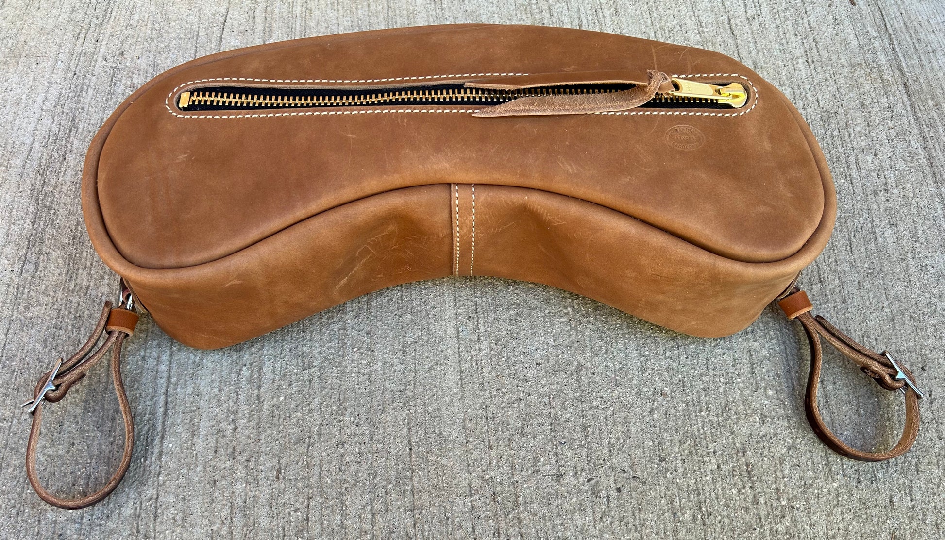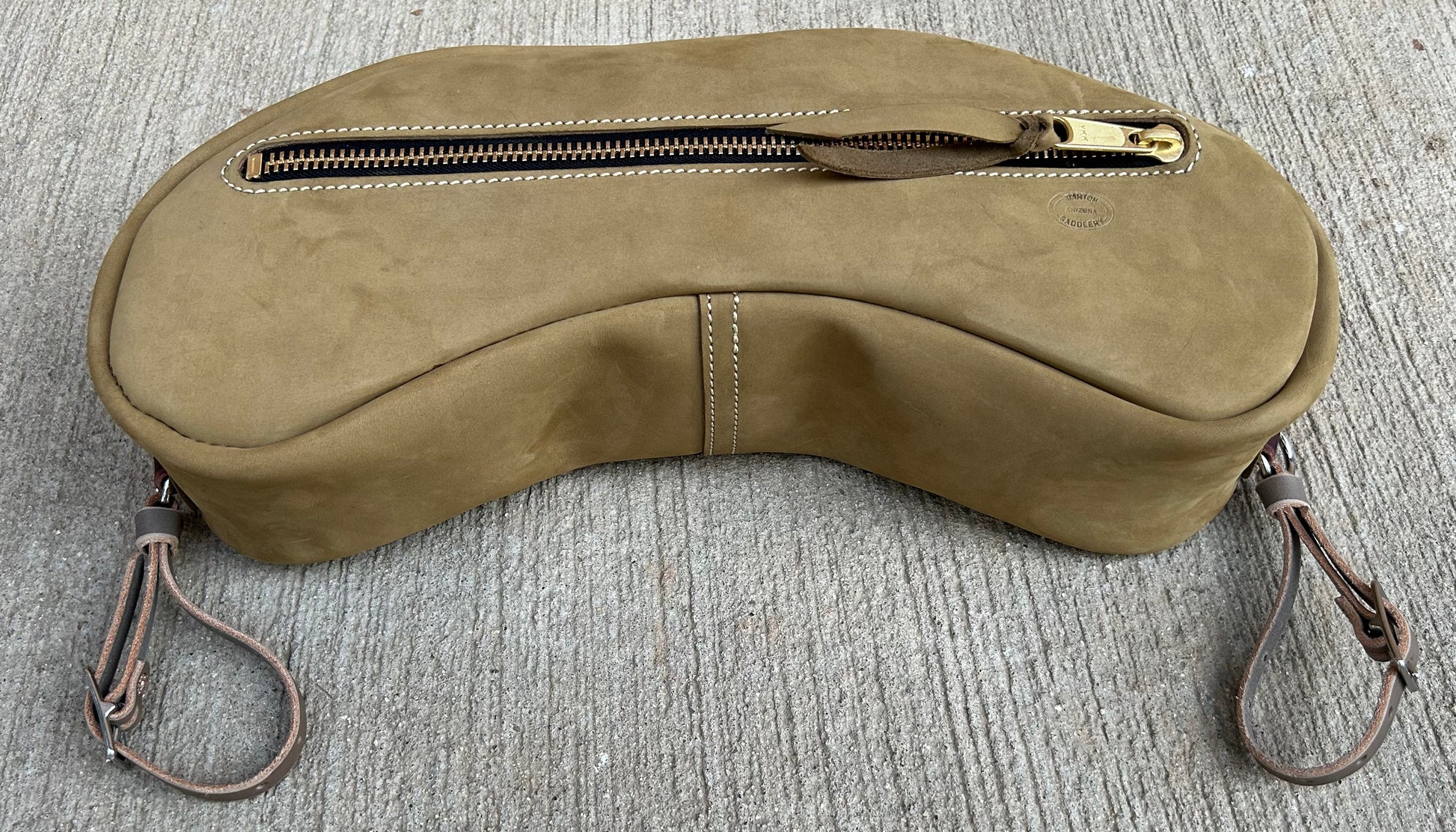 Large Cantle bag made of cowhide. The large size measures 18” long x 5” wide x 5” high. Comes with straps to secure bag to saddle.