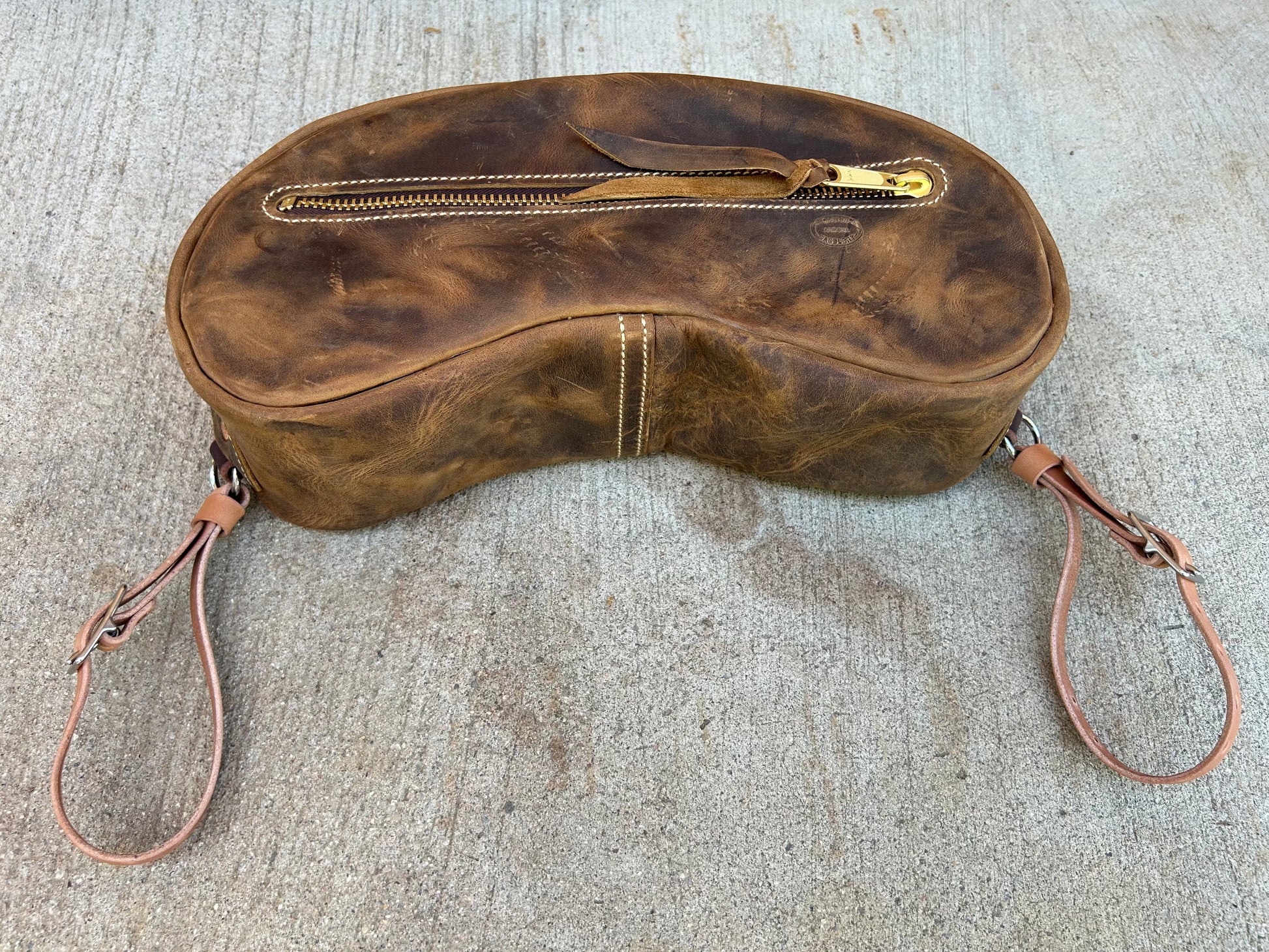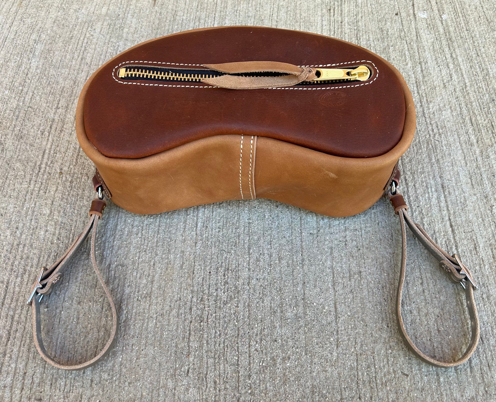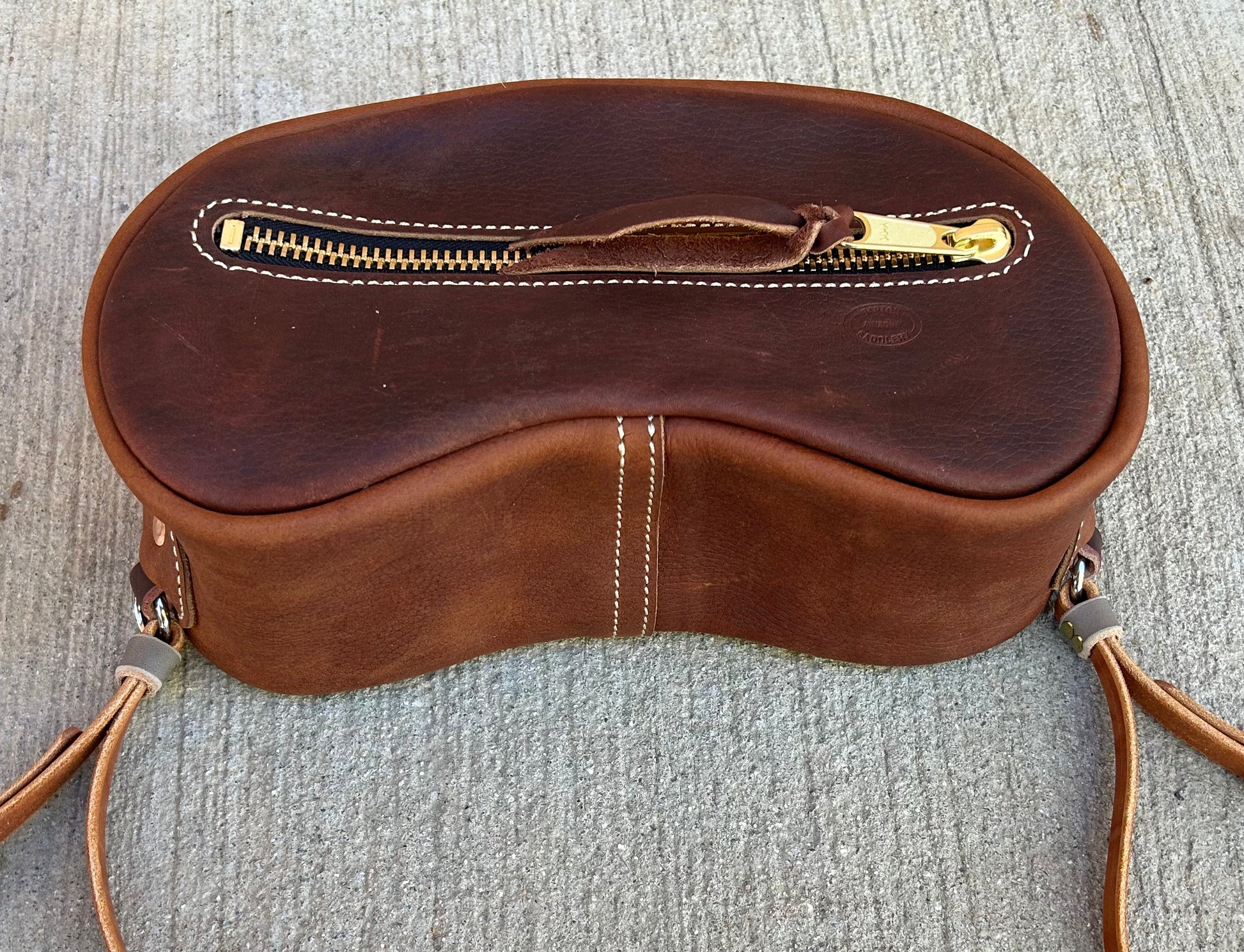 Small Cantle bag made of cowhide. The small measures 12” long x 5” wide x 5” high. Comes with straps to secure bag to saddle.