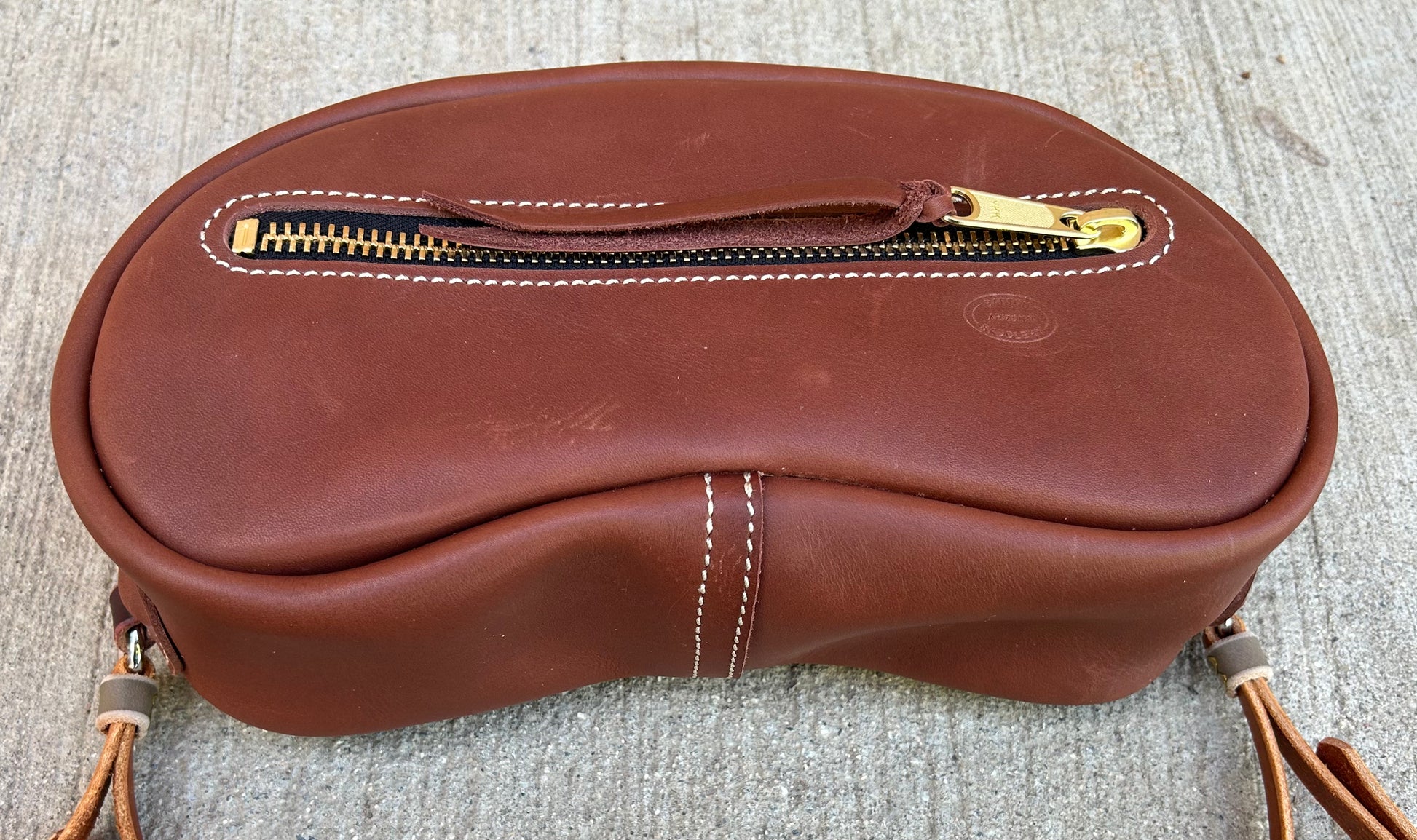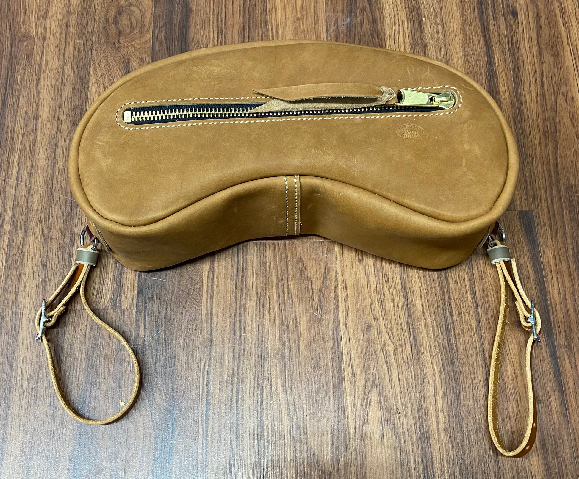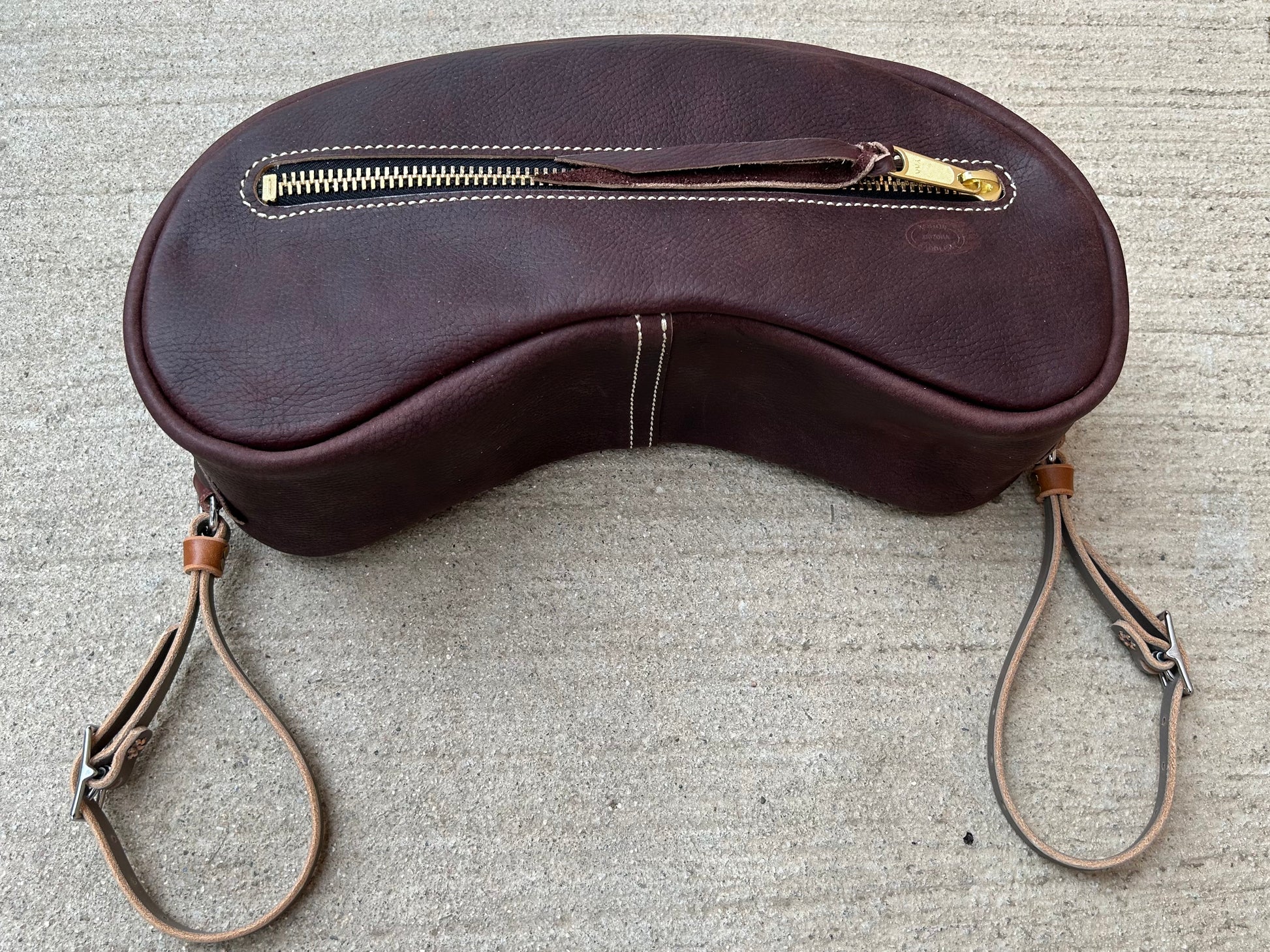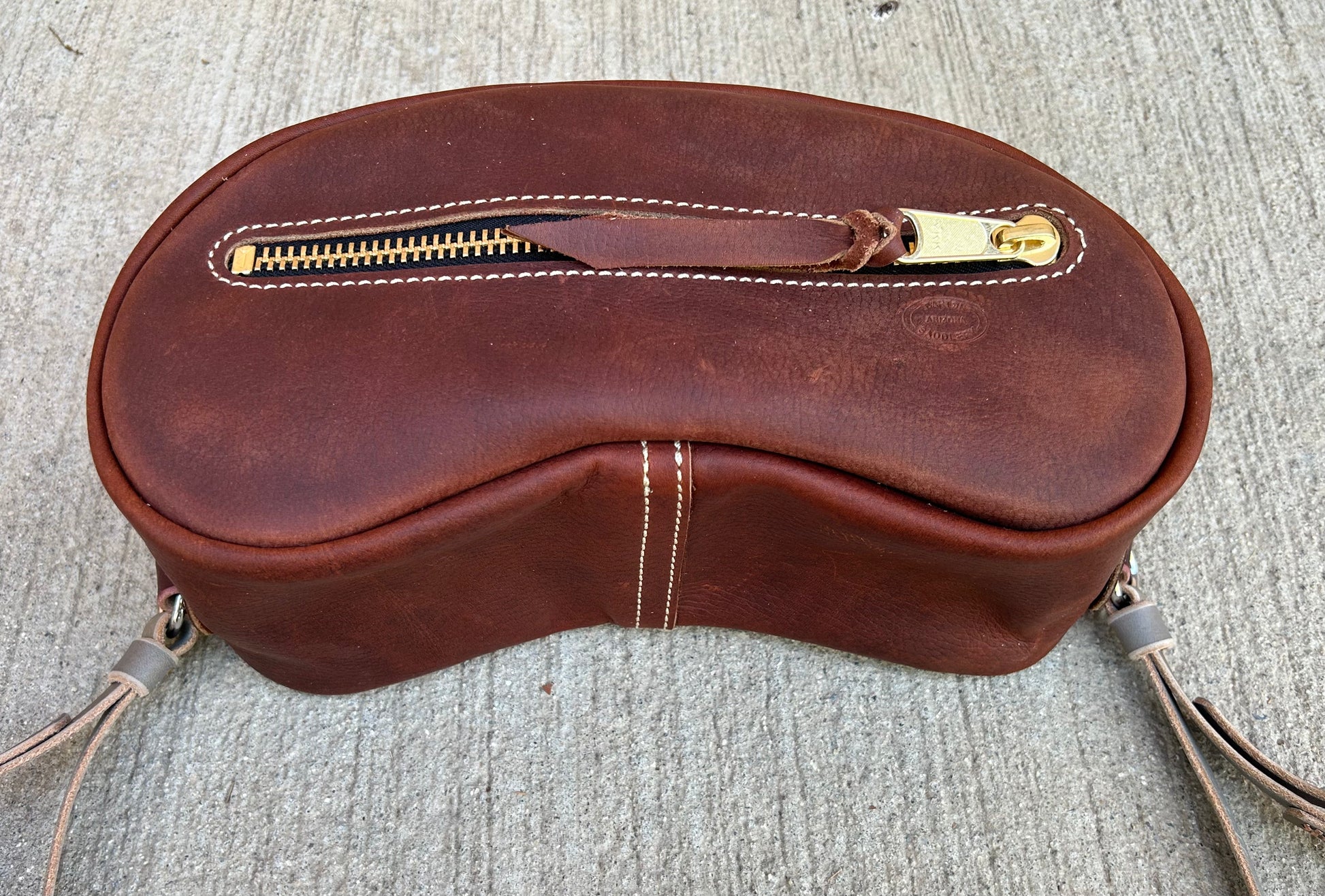 Small Cantle bag made of cowhide. The small measures 12” long x 5” wide x 5” high. Comes with straps to secure bag to saddle.