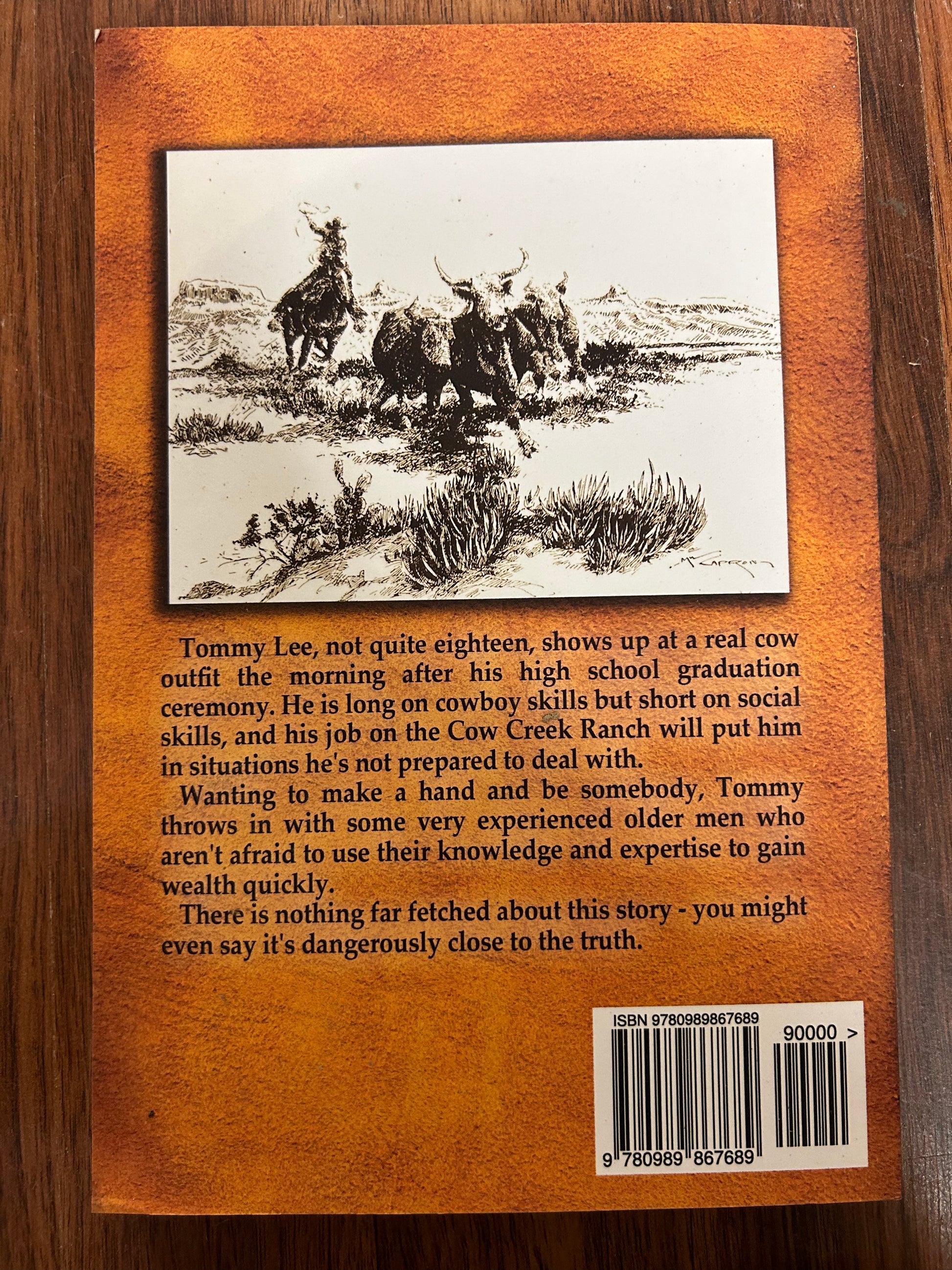 Tommy Lee, not quite eighteen, shows up at a real cow outfit the morning after his high school graduation ceremony. He is long on cowboy skills but short on social skills, and his job on the Cow Creek Ranch will put him in situations he's not prepared to deal with. Wanting to make a hand and be somebody, Tommy throws in with some very experienced older men who aren't afraid to use their knowledge and expertise to gain wealth quickly.There is nothing far fetched about this story - you might even say it's dangerously close to the truth.