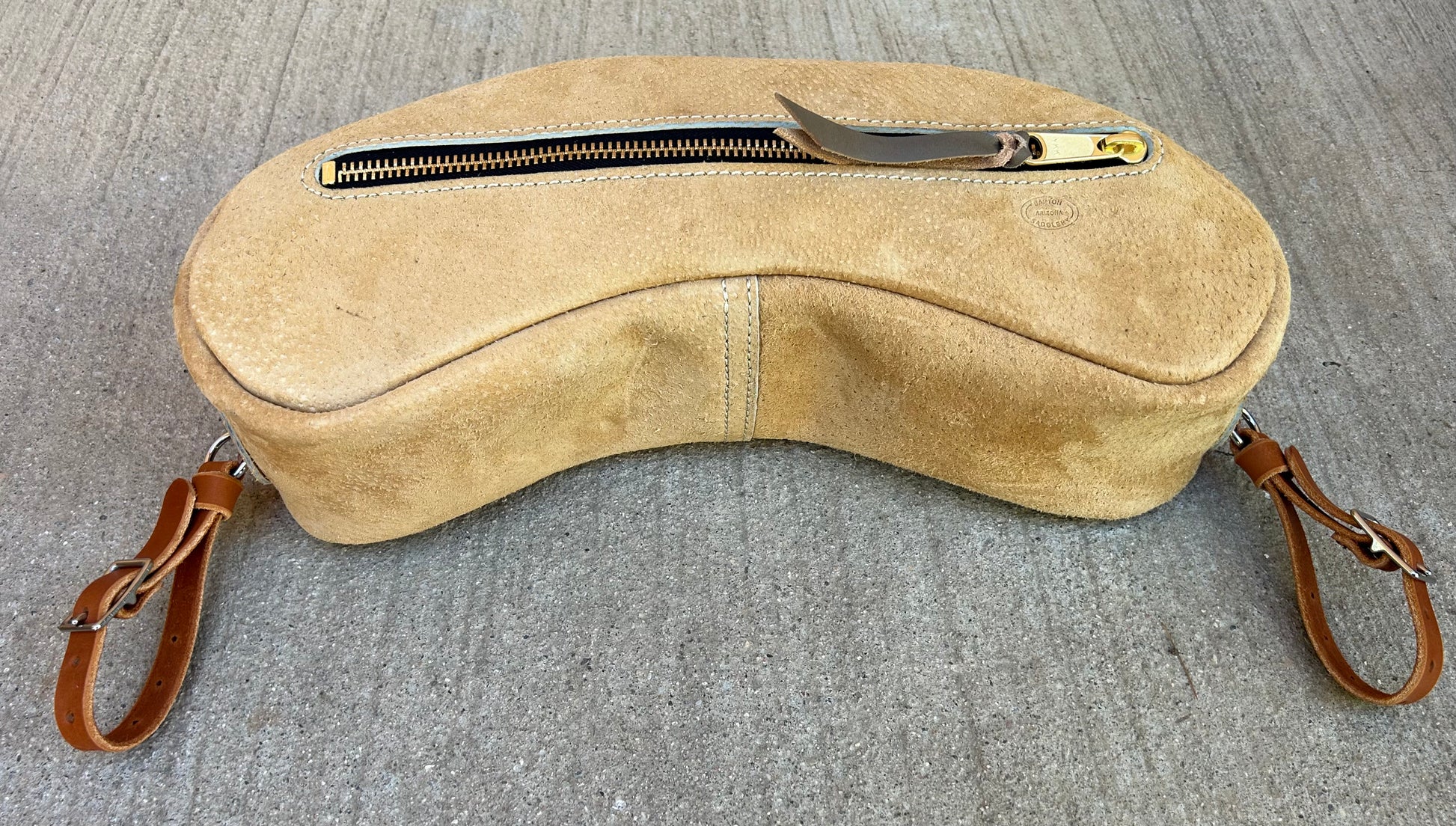 Large Cantle bag made of boarhide. The large size measures 18” long x 5” wide x 5” high. Comes with straps to secure bag to saddle.