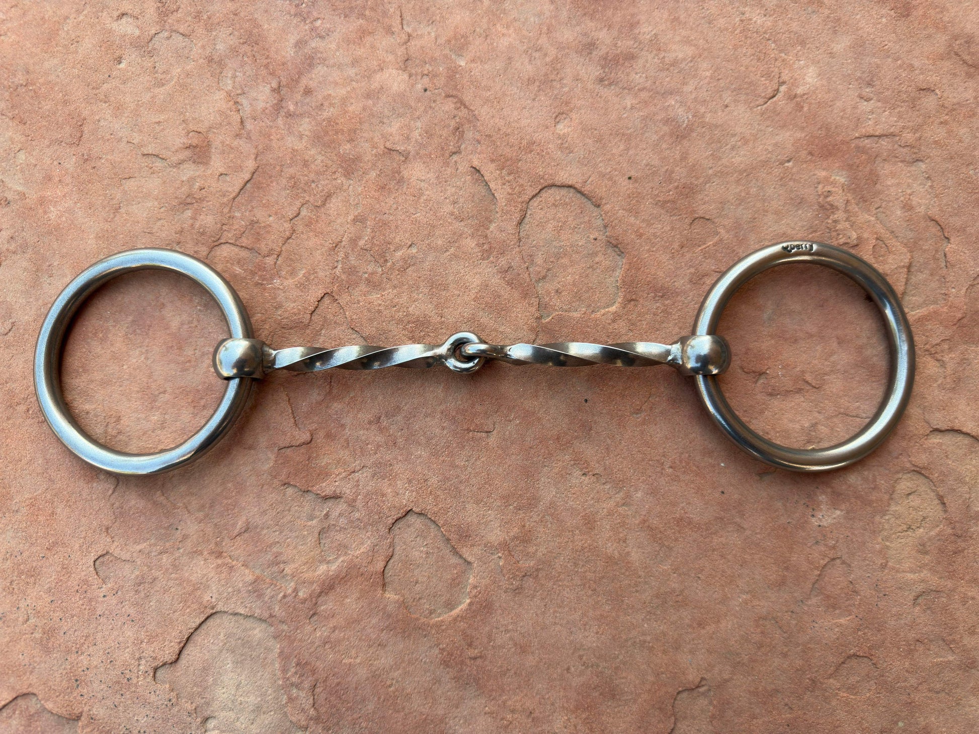 Square Twisted Wire Snaffle bit made by Graeme Quisenberry. The rings are 2 1/2”. Mouth measures 5 1/4” wide.