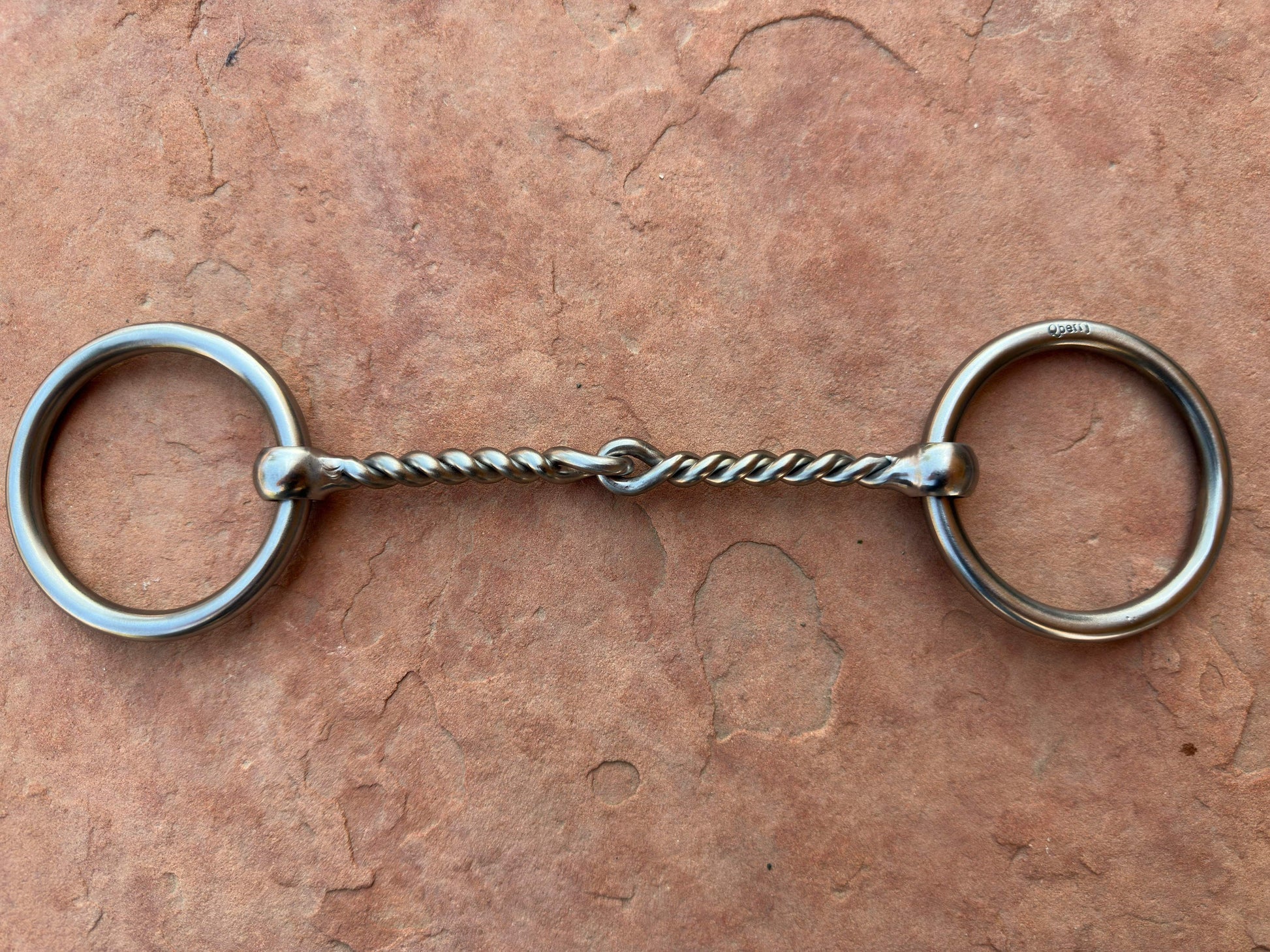 Twisted Wire Snaffle bit made by Graeme Quisenberry. The rings are 2 1/2”. Mouth measures 5 1/4” wide. Straight mouthpiece.
