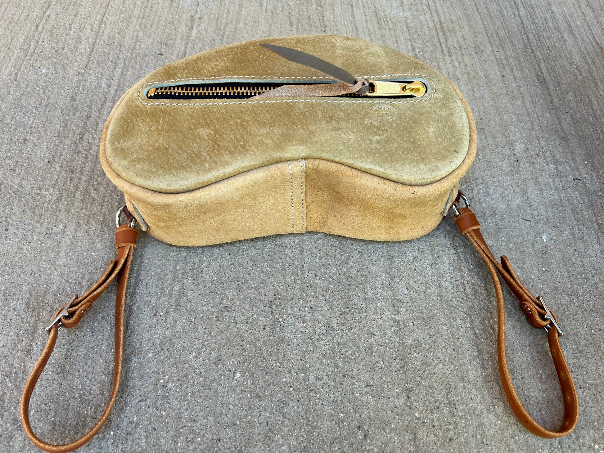 Small Cantle bag made of boarhide. The small measures 12” long x 5” wide x 5” high. Comes with straps to secure bag to saddle.