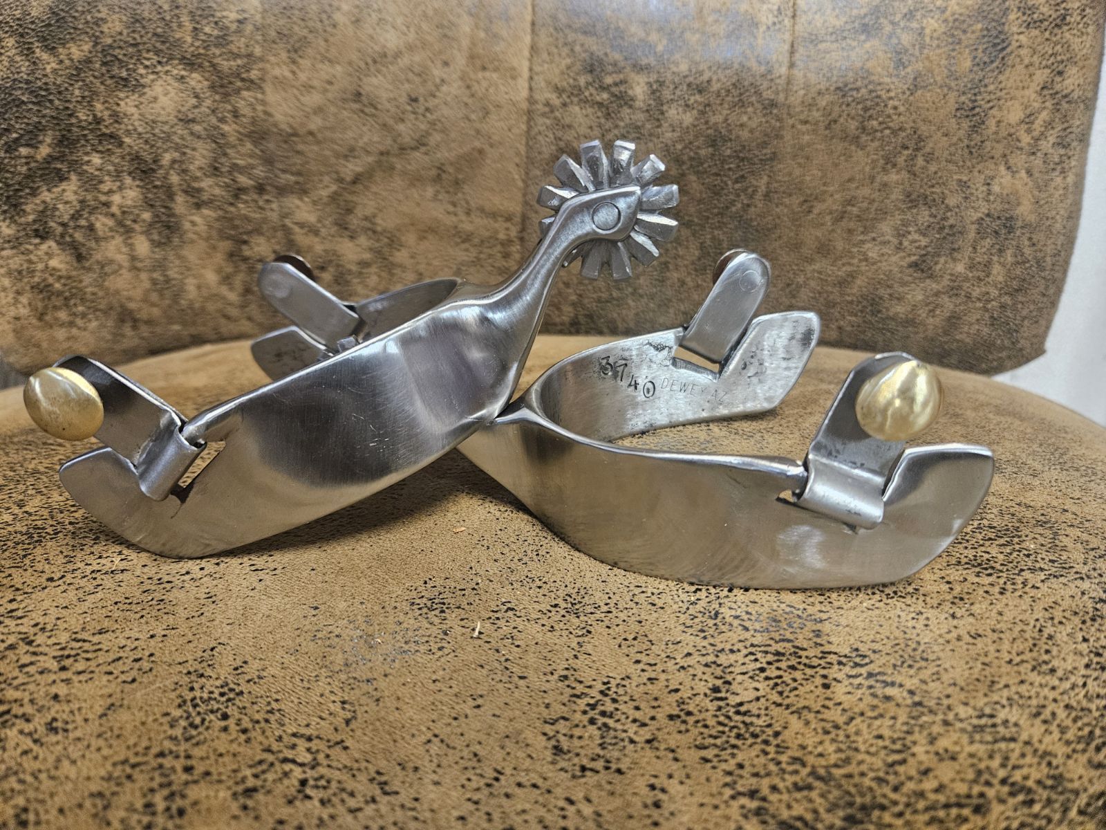 These spurs are patterned off a Blanchard #2 style. They have an 1 1/4” rowel and 1 1/4” band. These spurs are light and really fit a boot great!