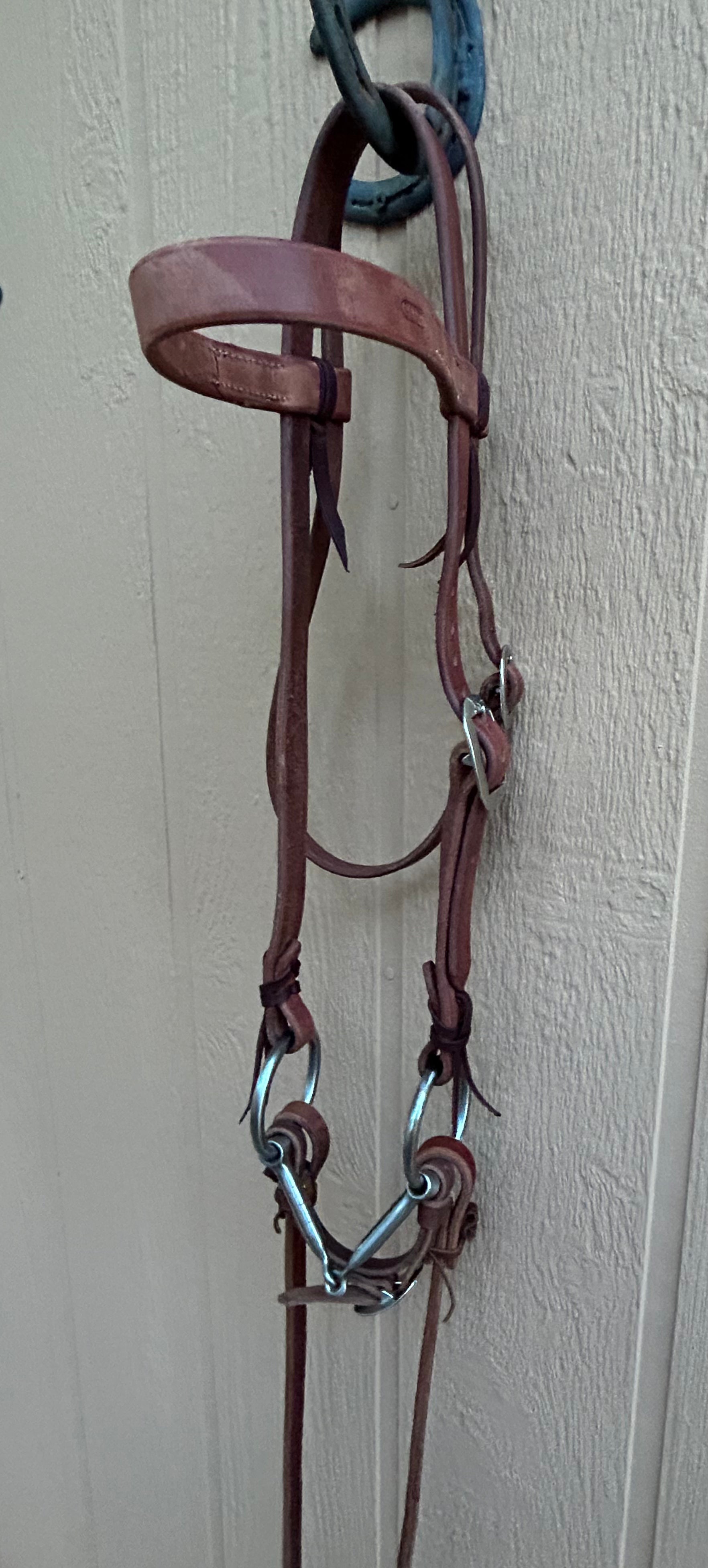 Snaffle bit made by Graeme Quisenberry rigged up on a heavy harness 1” browband headstall with 5/8” x 8’2” heavy harness reins and curb.